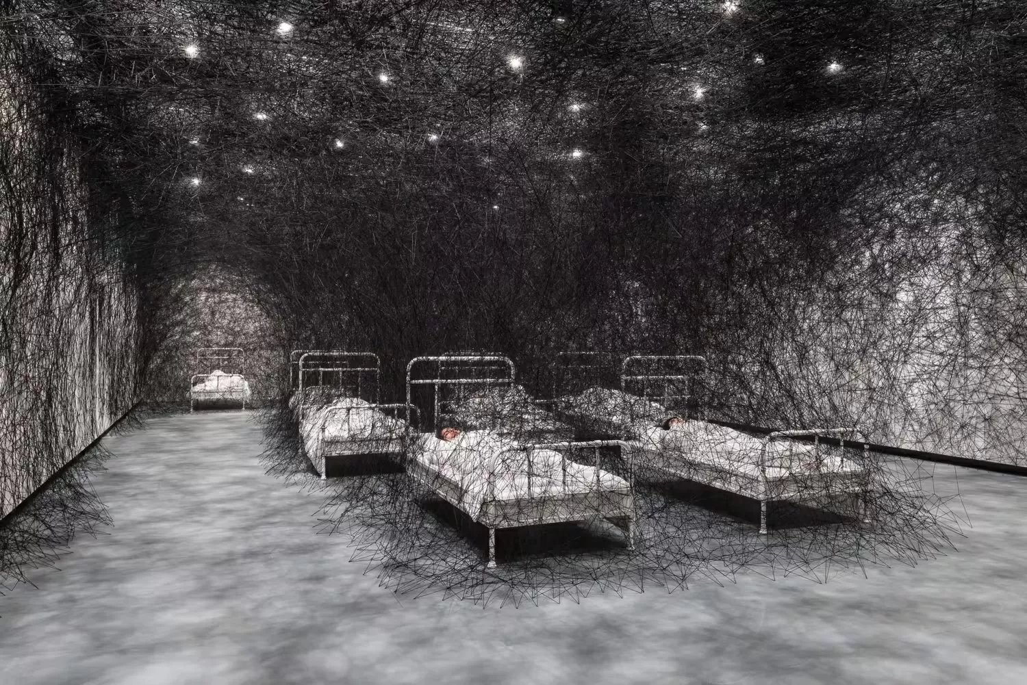 At first glance, the installation may seem intimidating, with its dark and tangled web of string. But as you take a closer look, you begin to notice the intricate details and the delicate balance of the entire piece. The string seems to have a life of its own, weaving in and out of the beds and creating a sense of chaos and order at the same time.